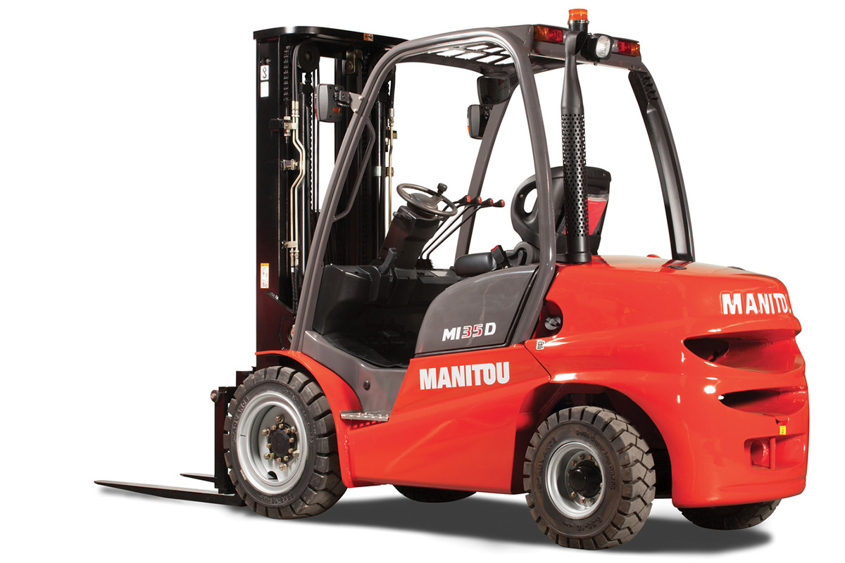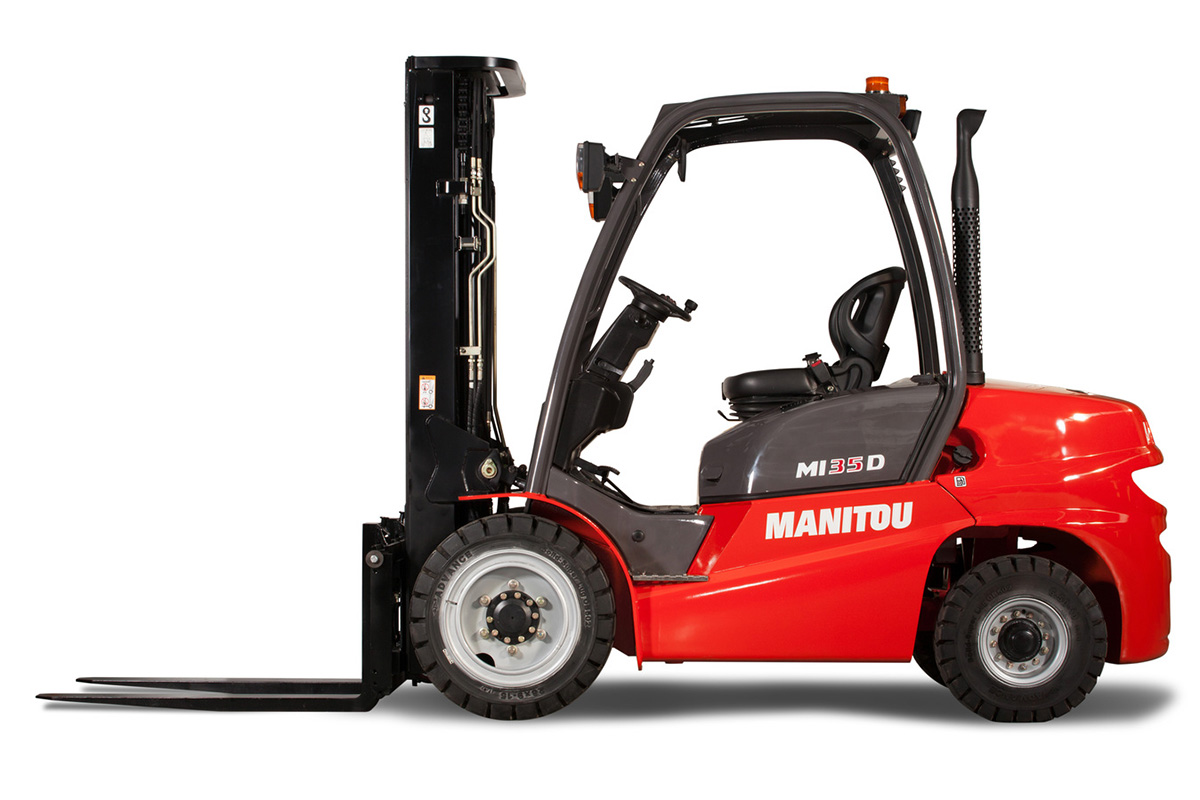 The Manitou industrial forklift MI-X 35 has been designed for both indoor and outdoor use to meet industrial market expectations such as simplicity, comfort, reliability, and efficiency with the lowest total cost of ownership. The MI-X 35 is available in LPG version with a Nissan LGP engine and Diesel with a Yanmar Premium Diesel Engine. Reducing downtime is a key factor in reducing costs of ownership and the MI-X 35 simplicity of design helps keep maintenance costs down.